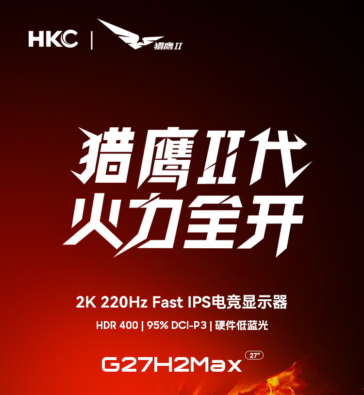 商品名称:HKC 27英寸2K 220Hz高刷FastIPS快速液晶HDR400电竞1ms硬件低蓝光PS5三角洲游戏电脑显示器G27H2Max