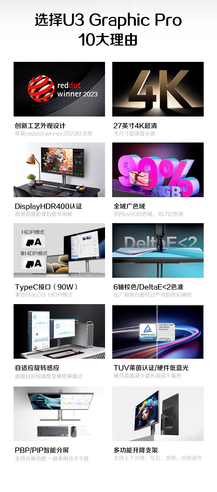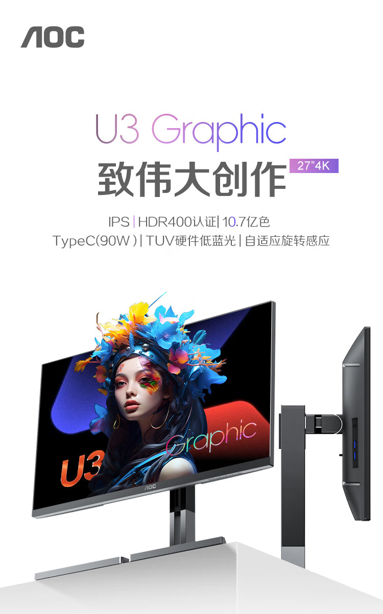 商品名称:AOC 27英寸4K HDR400广色域 Type-C90W 自适应旋转感应 TUV硬件低蓝光不闪 节能办公电脑显示器U27U3D