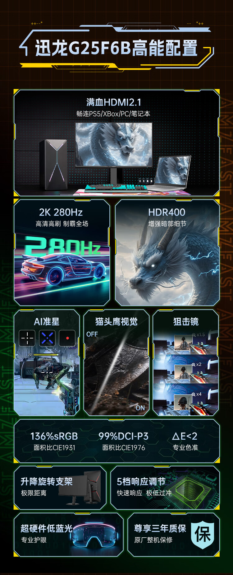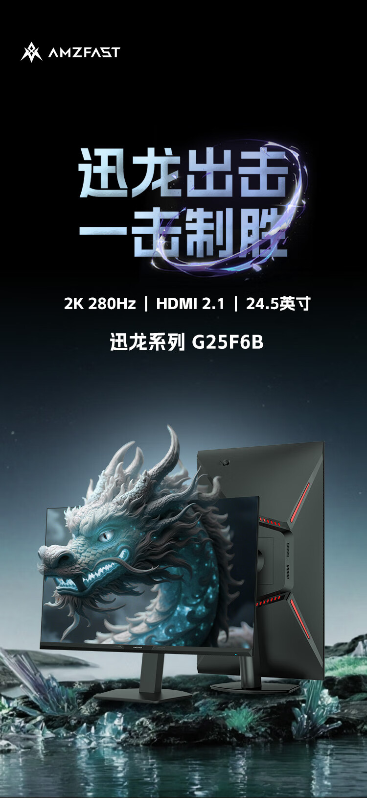 AMZFAST 24.5英寸 2K 280Hz电竞显示器 HDR400硬件低蓝光 450nit FastIPS 三角洲游戏电脑屏幕 迅龙G25F6B